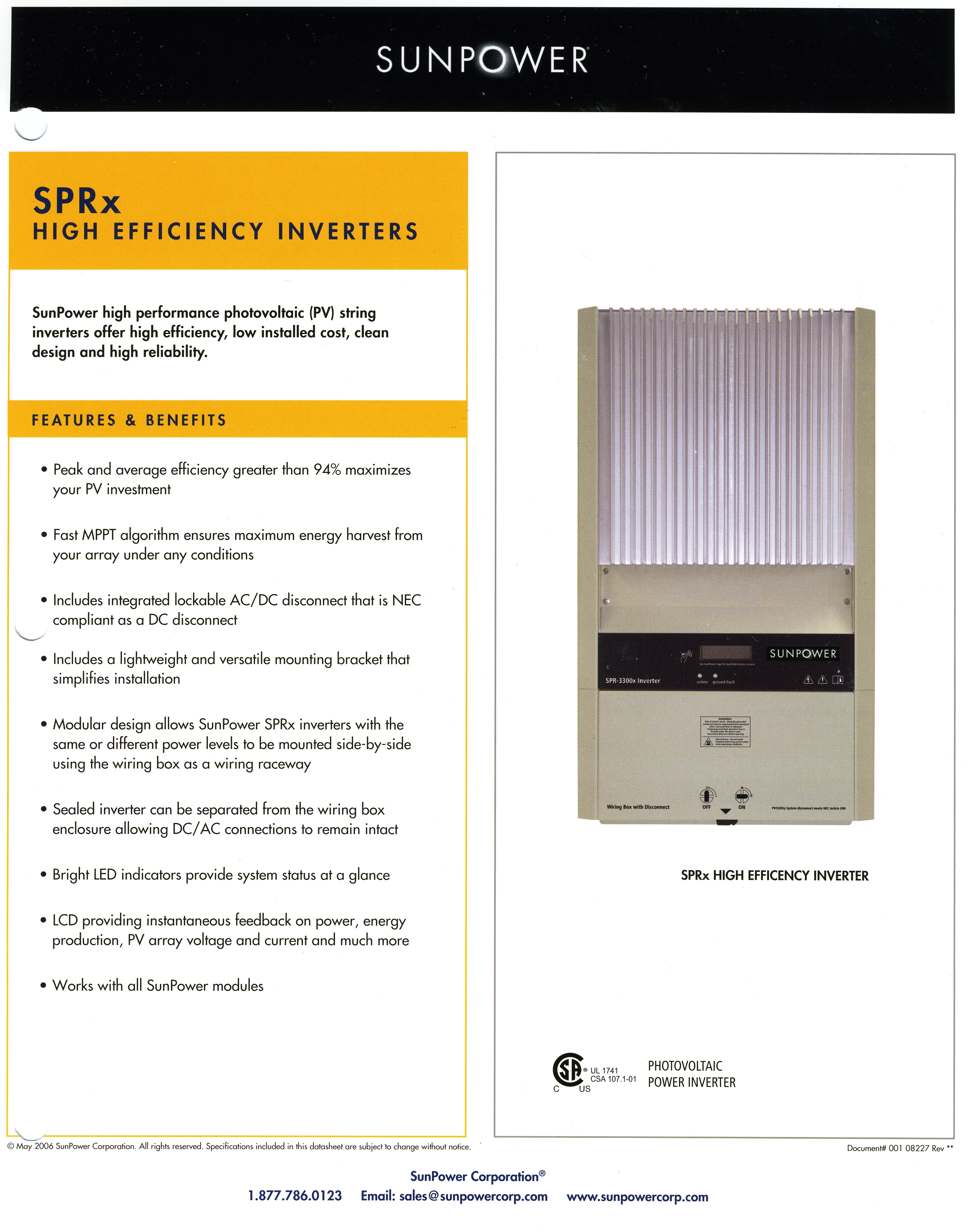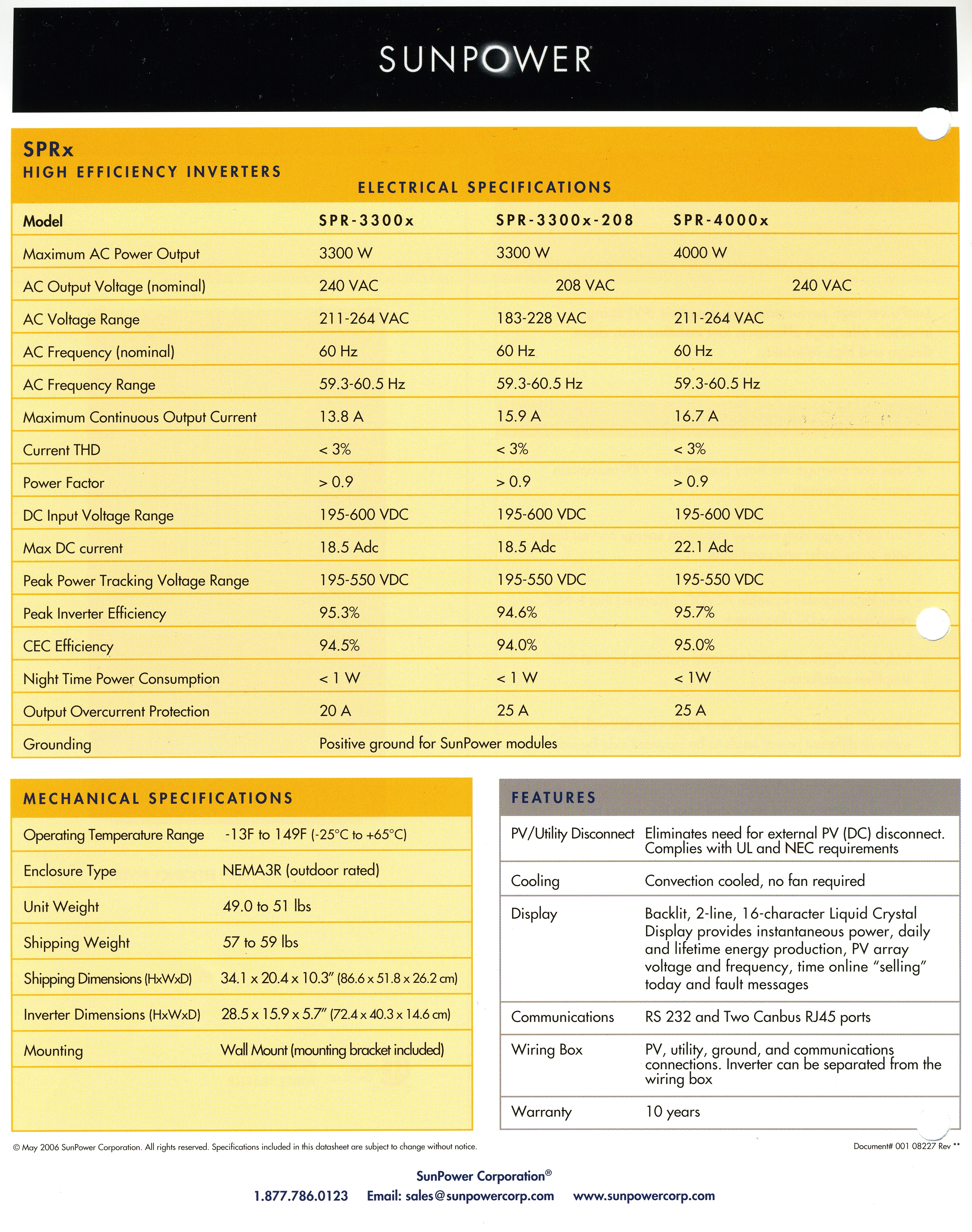 The inverter used is a Sunpower SPR-4000x (Spec-1, Spec-2). Note that this is the same as the Xantrex GT Grid Tied inverter. Xantrex provides a very nice monitoring station that provides the same functionality you can get from standing outside at the inverter. The also provide a monitoring tool for Windows operating system available at the same link above for Xantrex GT Grid Tied. Look in the upper right corner and click on "GT-View Inverter Software" to download it. Sunpower also provides a network tool for monitoring your data but this requires that you store your data on their servers.